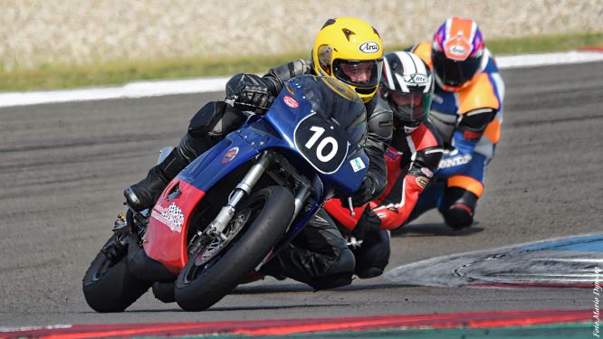 Unser zweites Rennen war auch das letzte des Wochenendes und fand am späteren Sonntagnachmittag bei Temperaturen von 29 – 30 °C statt. In der kleinen Klasse bis 125 ccm ging wieder kein Weg an Jerry van de Bunt vorbei. Auf Platz zwei folgte Miguel. Reiner Scheidhauer fiel leider durch technischen Defekt aus und so erbte Gerhard Wilshaus bei seinem IGK Debüt den dritten Platz. In der Serienklasse konnte Markus Pekacar auch mit Hilfe von Thomas Wöhleke und Teilelieferungen aus Deutschland sein Motorrad wieder fit bekommen. Markus konnte sich den zweiten Platz hinter Thomas und vor Christorf Schäfer sichern. Wie sollte es in Assen anders sein, als das sich ein Rennen in der Geert Timmer Bocht entscheidet. Marcel Mendel geht als Führender in die letzte Schikane und muss sich Erwin Postmus erwehren. Erwin kann Marcel aber nicht mehr abfangen und wird 0,4 Sekunden hinter Marcel zweiter. Othmar Atzmüller wurde hinter diesem Duo dritter der 250er Klasse. Die Ronax von Ron hatte technische Probleme und so konnte Peter Sydel seine Eigenbau Yamazuki zu ihrem ersten Sieg im zweiten Rennen führen. Auf den Plätzen folgen, nach sehenswerten Zweikampf) Stephan Grün #9 und Jean Marc Souvignier #8.