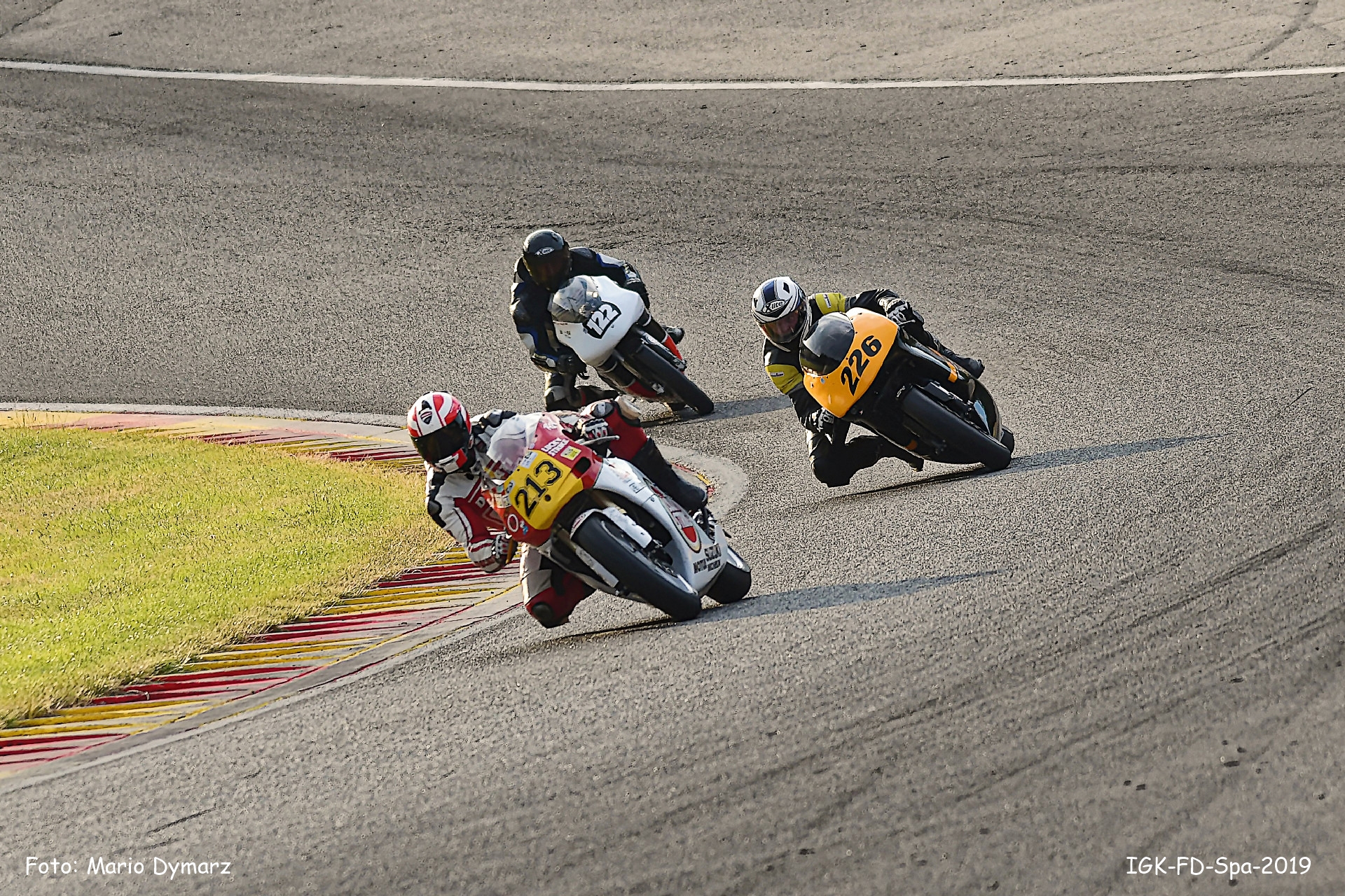 Mit etwas Abstand folgte Ron Schönfelder dicht gefolgt von Mike Vökt, der das Tempo der Ronax 500 mitgehen konnte. Andre Sawford, Maudie Vennstra und Marcel Mendel mussten zur Spitze etwas abreißen lassen. An einigen Stellen tröpfelte es mal mehr mal weniger, was allerdings auf den Grip keine Auswirkungen hatte. In Runde 4 stürzte Markus Pekacar in der Eau Rouge und erlitt leichte Verletzungen. Kurzzeitig war dieser Streckenabschnitt mit gelbem Blinklicht versehen. Im weiteren Rennverlauf gab es in der Klasse GP125 einen engen Kampf zwischen Chris Meyer, Miguel Correia-Lourenco und Vincent Levieux, hier lagen die schnellsten Rundenzeiten gerade mal 0,4 Sek. auseinander und so sah auch der Zieleinlauf aus mit einer Differenz von 1,6 Sek.