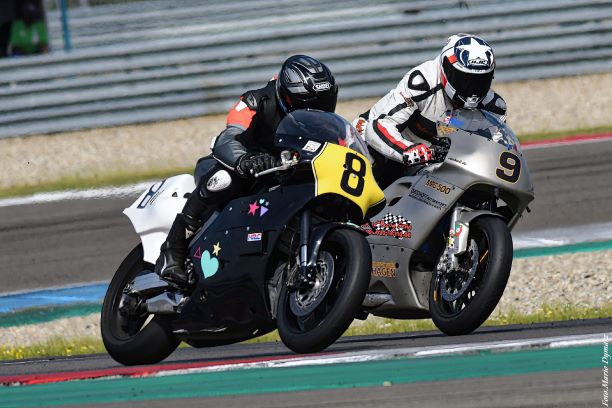 Unser zweites Rennen war auch das letzte des Wochenendes und fand am späteren Sonntagnachmittag bei Temperaturen von 29 – 30 °C statt. In der kleinen Klasse bis 125 ccm ging wieder kein Weg an Jerry van de Bunt vorbei. Auf Platz zwei folgte Miguel. Reiner Scheidhauer fiel leider durch technischen Defekt aus und so erbte Gerhard Wilshaus bei seinem IGK Debüt den dritten Platz. In der Serienklasse konnte Markus Pekacar auch mit Hilfe von Thomas Wöhleke und Teilelieferungen aus Deutschland sein Motorrad wieder fit bekommen. Markus konnte sich den zweiten Platz hinter Thomas und vor Christorf Schäfer sichern. Wie sollte es in Assen anders sein, als das sich ein Rennen in der Geert Timmer Bocht entscheidet. Marcel Mendel geht als Führender in die letzte Schikane und muss sich Erwin Postmus erwehren. Erwin kann Marcel aber nicht mehr abfangen und wird 0,4 Sekunden hinter Marcel zweiter. Othmar Atzmüller wurde hinter diesem Duo dritter der 250er Klasse. Die Ronax von Ron hatte technische Probleme und so konnte Peter Sydel seine Eigenbau Yamazuki zu ihrem ersten Sieg im zweiten Rennen führen. Auf den Plätzen folgen, nach sehenswerten Zweikampf) Stephan Grün #9 und Jean Marc Souvignier #8.