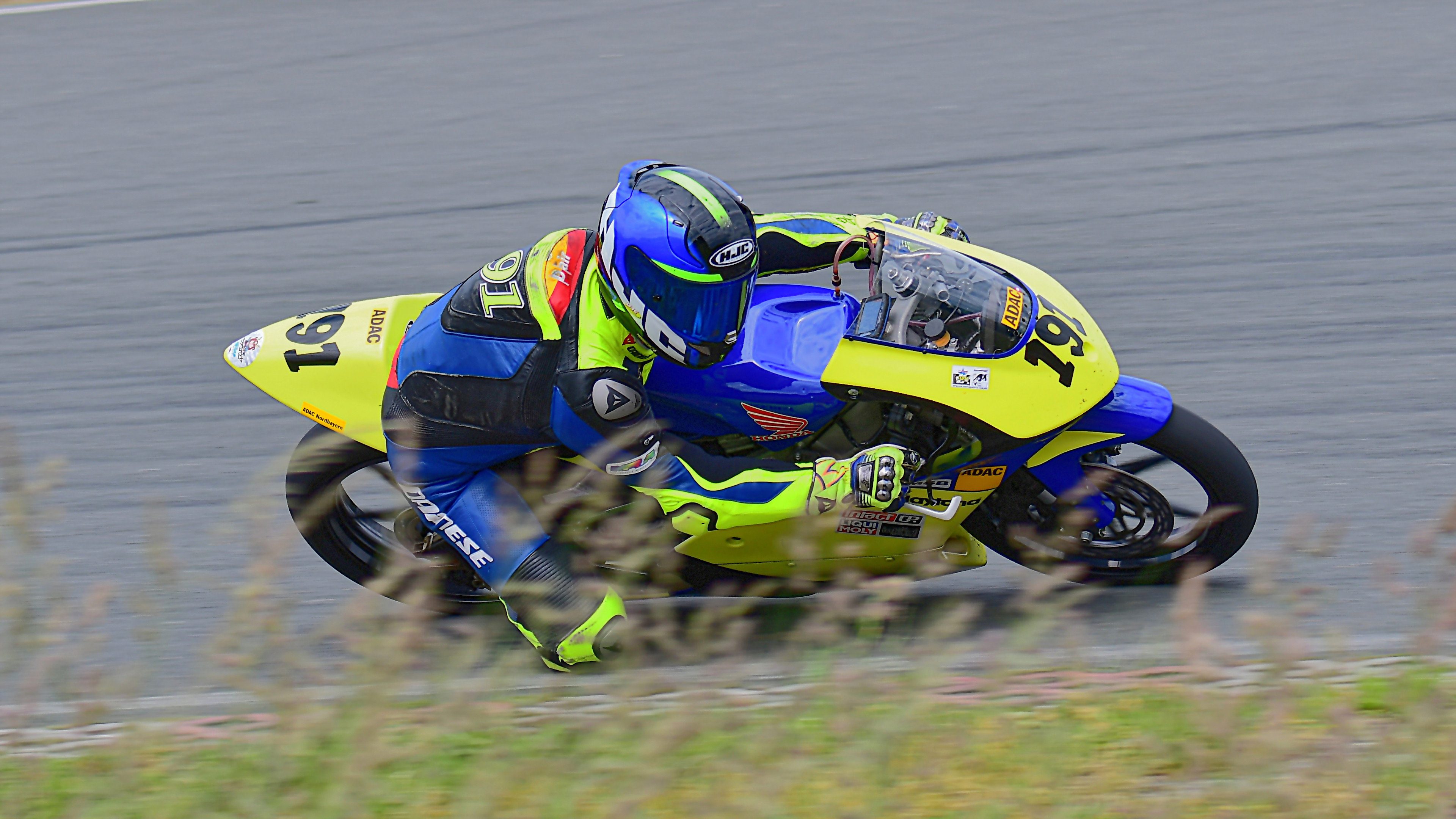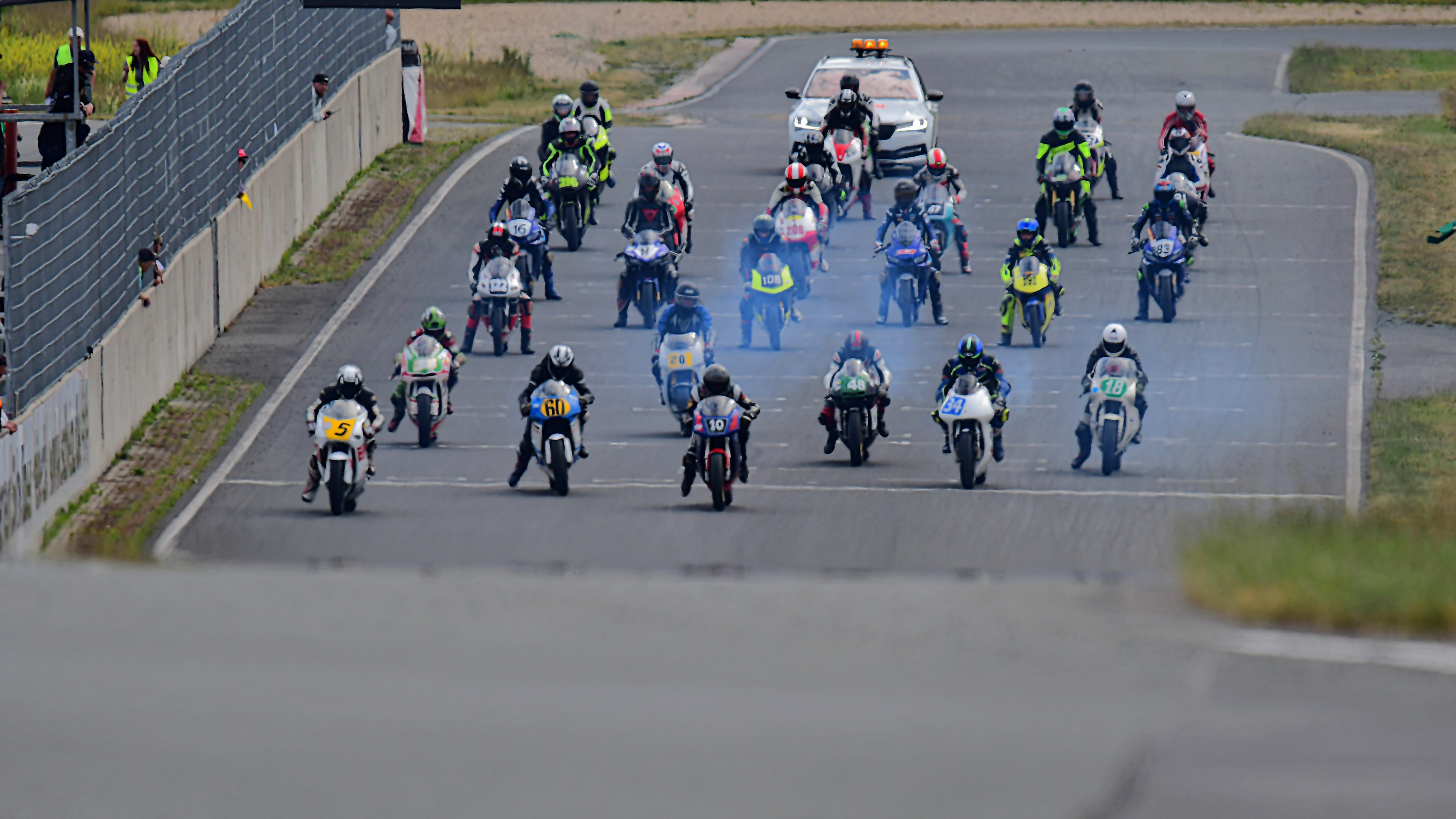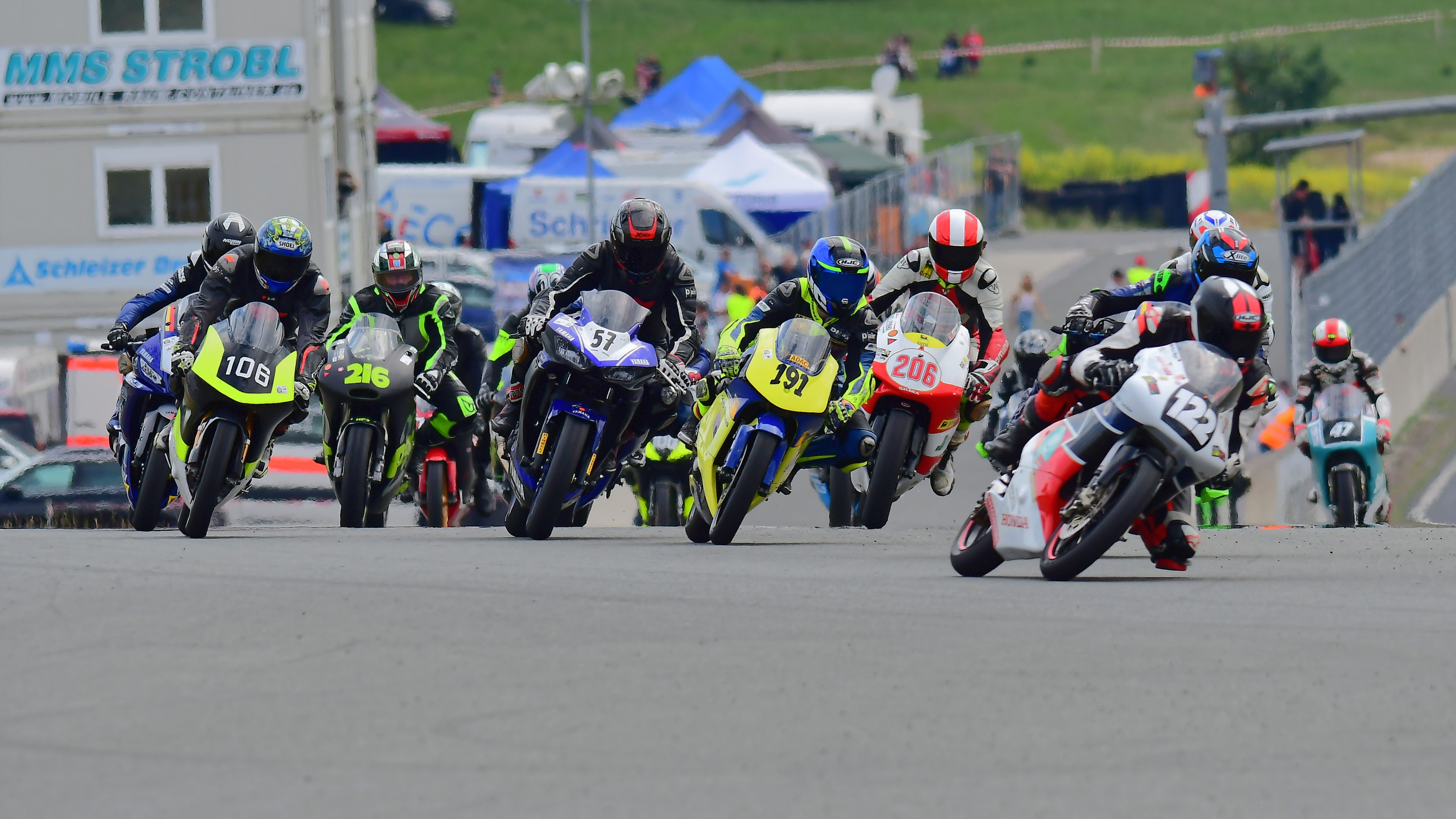 Die Spitze der zweiten Welle wurde von Chris Meyer auf seiner Honda RS125 angeführt. Neben ihn stand Moritz Klaus auf der RS125. Die Reihe komplettierte Patrick Eckert nach 2 jähriger Rennabstinenz auf seiner Moto3 Honda. Noch vor dem schnellsten SP250 Fahrer Jörg Eberhardt stand unsere 4 Gaststarter auf den R3 Cup Maschinen. Wir hatten den Junioren so die Möglichkeit gegeben, die anspruchsvolle Piste vor dem Rennen im Rahmen der IDM kennen zu lernen.