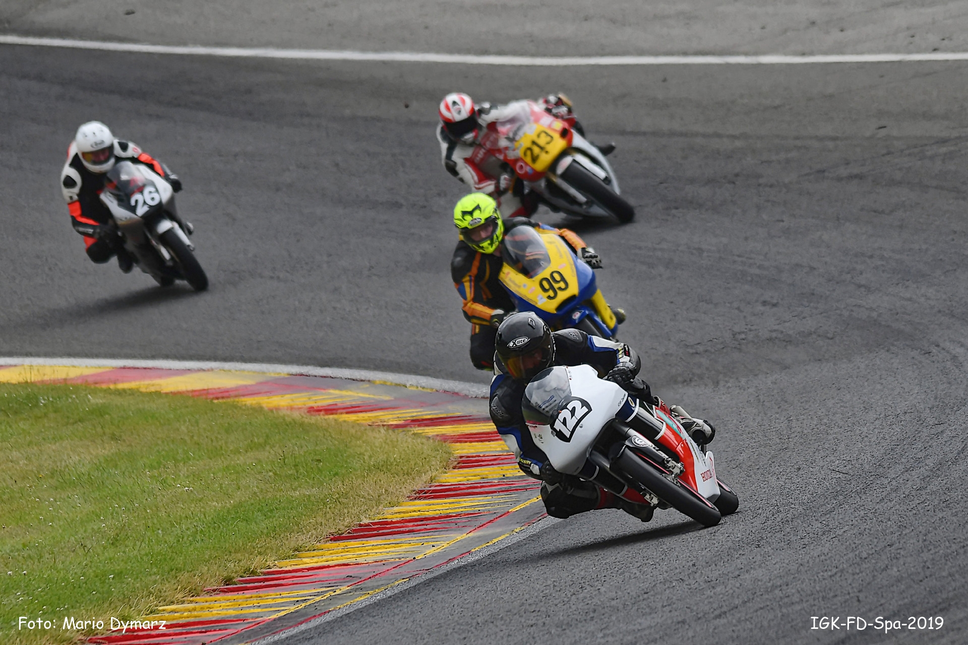 Mit etwas Abstand folgte Ron Schönfelder dicht gefolgt von Mike Vökt, der das Tempo der Ronax 500 mitgehen konnte. Andre Sawford, Maudie Vennstra und Marcel Mendel mussten zur Spitze etwas abreißen lassen. An einigen Stellen tröpfelte es mal mehr mal weniger, was allerdings auf den Grip keine Auswirkungen hatte. In Runde 4 stürzte Markus Pekacar in der Eau Rouge und erlitt leichte Verletzungen. Kurzzeitig war dieser Streckenabschnitt mit gelbem Blinklicht versehen. Im weiteren Rennverlauf gab es in der Klasse GP125 einen engen Kampf zwischen Chris Meyer, Miguel Correia-Lourenco und Vincent Levieux, hier lagen die schnellsten Rundenzeiten gerade mal 0,4 Sek. auseinander und so sah auch der Zieleinlauf aus mit einer Differenz von 1,6 Sek.