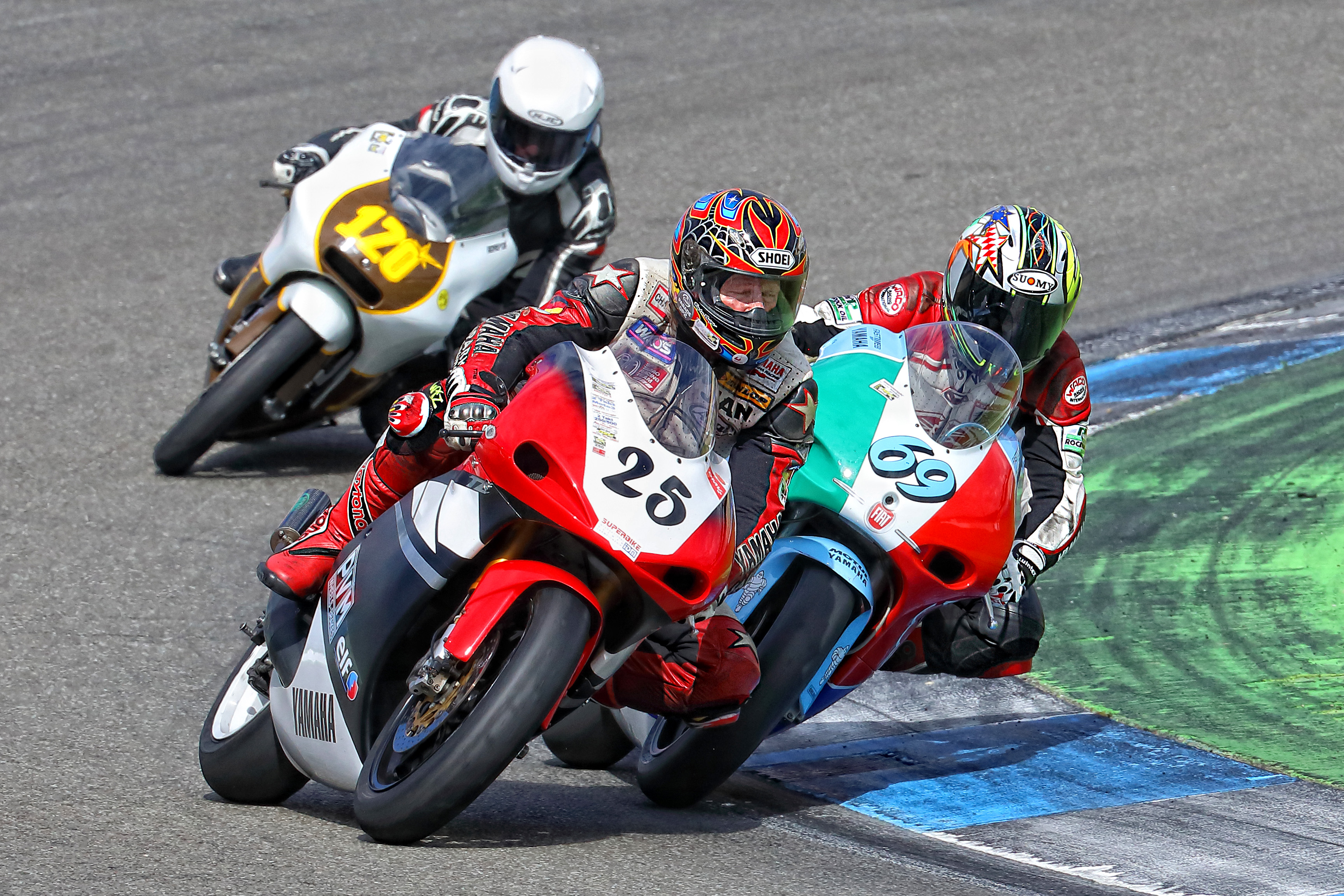 Dicht gefolgt vom Geburtstagskind Othmar Atzmüller #69 im ersten Bild im Fight mit Jan Clausen auf TZ250.